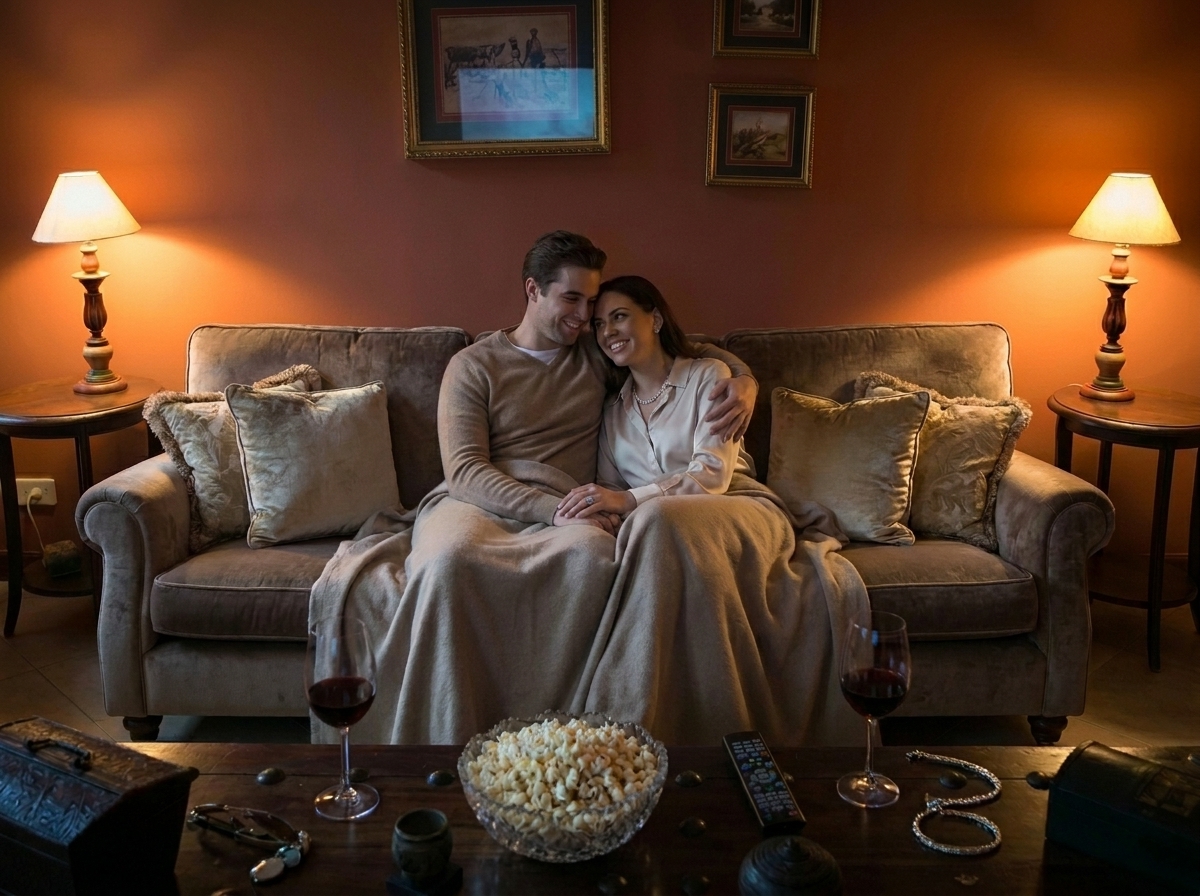 Para as noites frias da serra, o Home Theater do resort oferece uma experiência cinematográfica de verdade. Sala privativa, tela grande, som envolvente — com pipoca, manta e a liberdade de escolher o que ver. Porque às vezes a melhor saída é não sair.