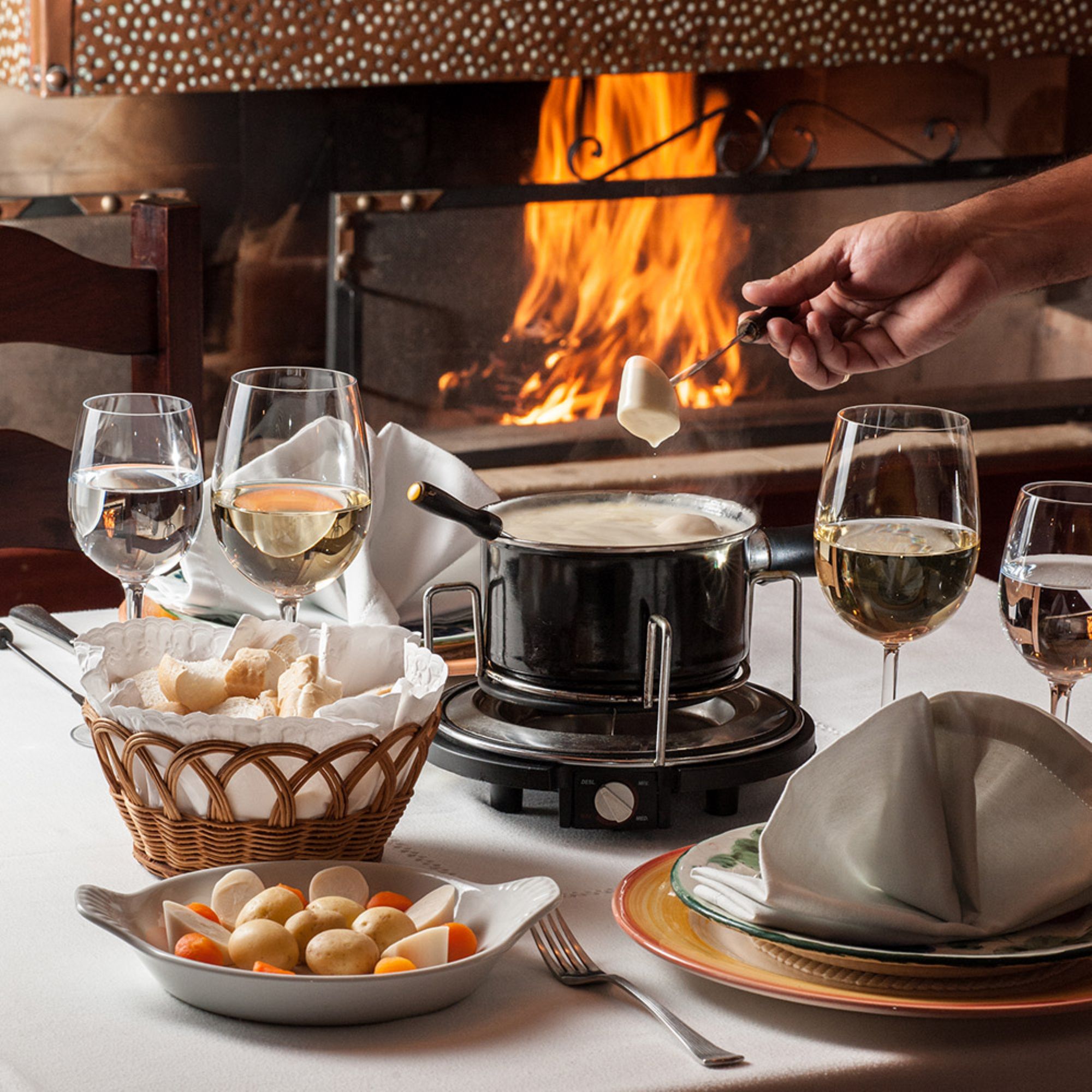 Nas noites frias da serra, o fondue vira ritual. Carne servida em consommé fumegante com toque de vinho. Queijo derretido. Chocolate para fechar. Ou os três juntos, para quem não quer escolher. E para os apreciadores: a autêntica Raclette Montagnarde, direto dos Alpes para o vale do Cuiabá.