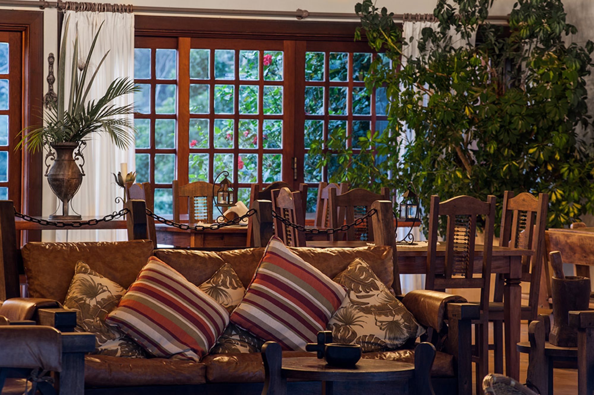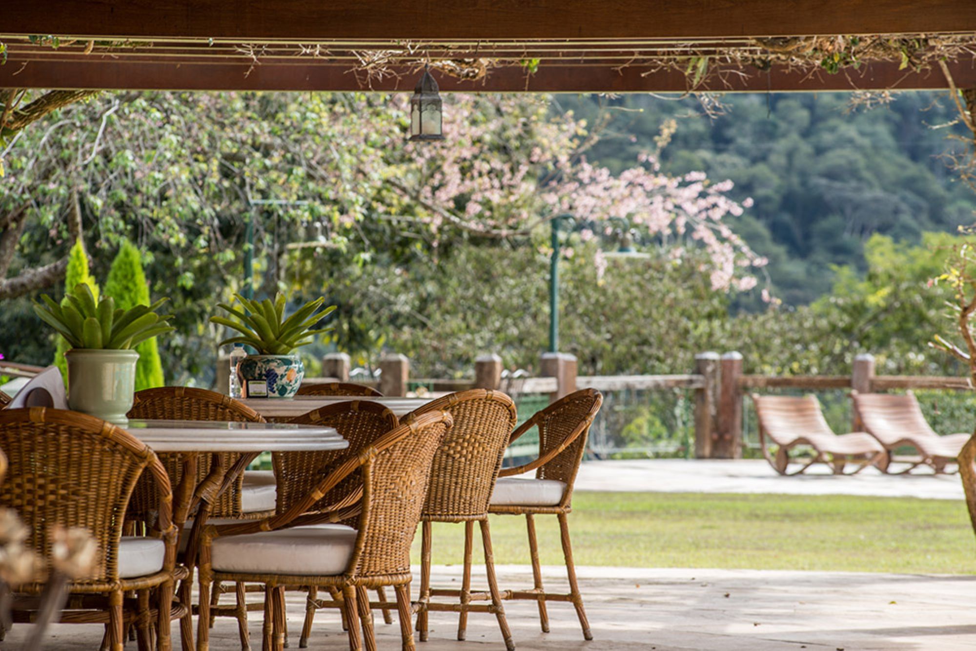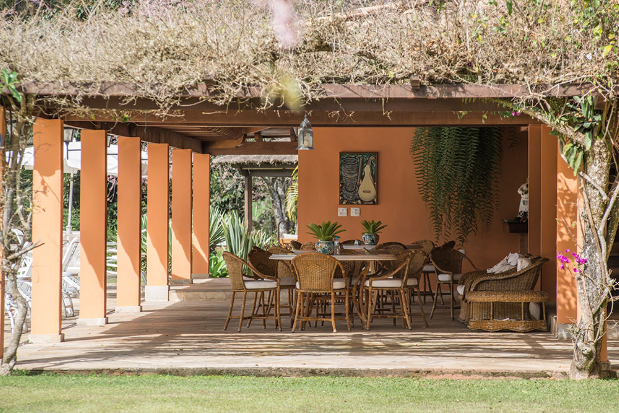 À beira da piscina, sob uma varanda coberta por buganvílias. Petiscos, sanduíches, drinques gelados e, aos sábados, a feijoada que virou tradição da casa. Pés na grama, copo na mão, sol no rosto. O restaurante onde ninguém tem pressa — e ninguém precisa ter.